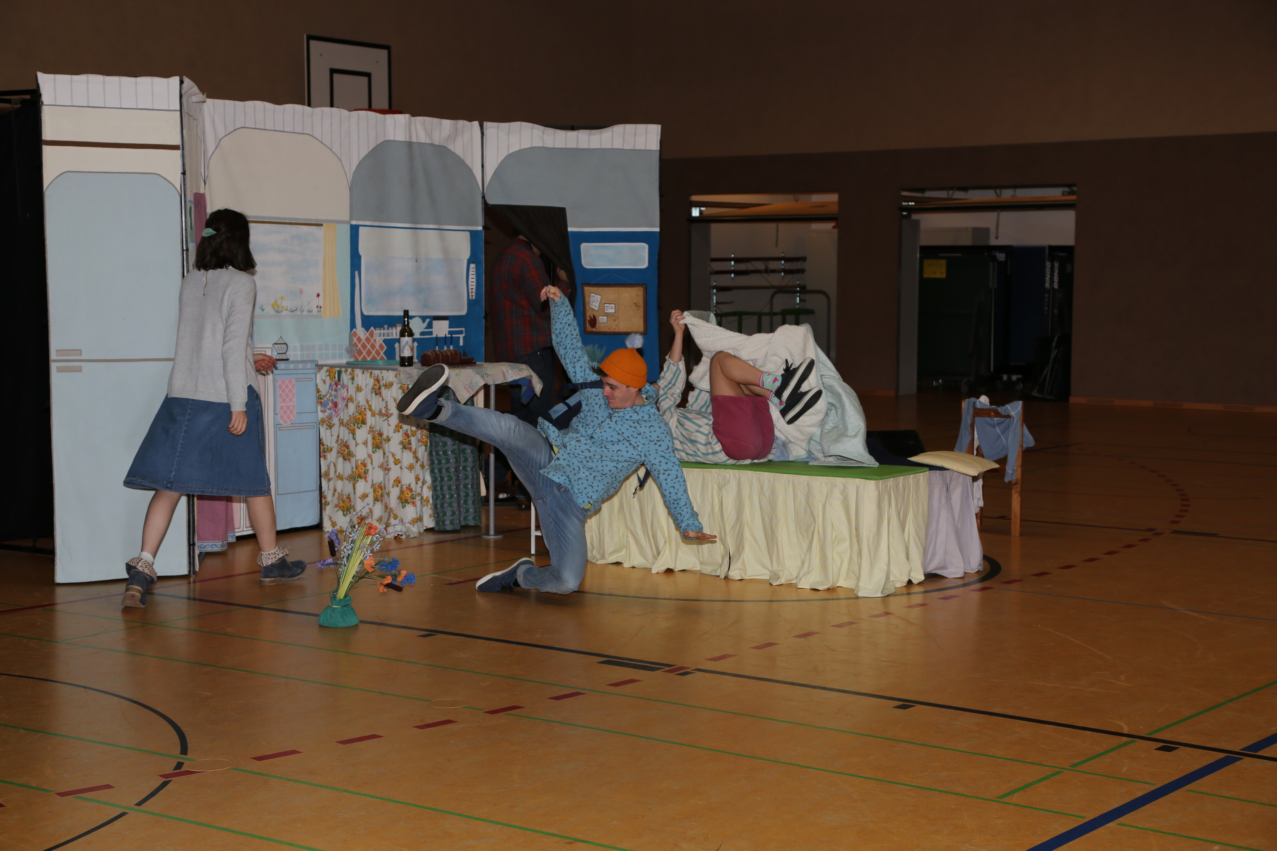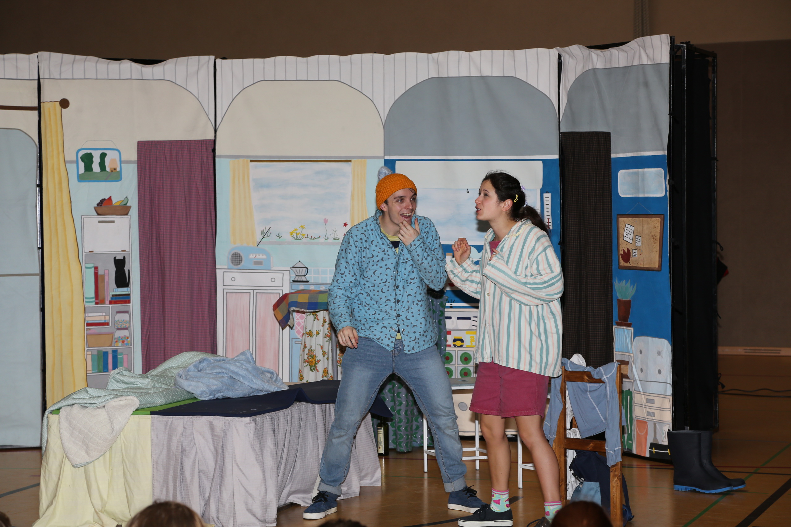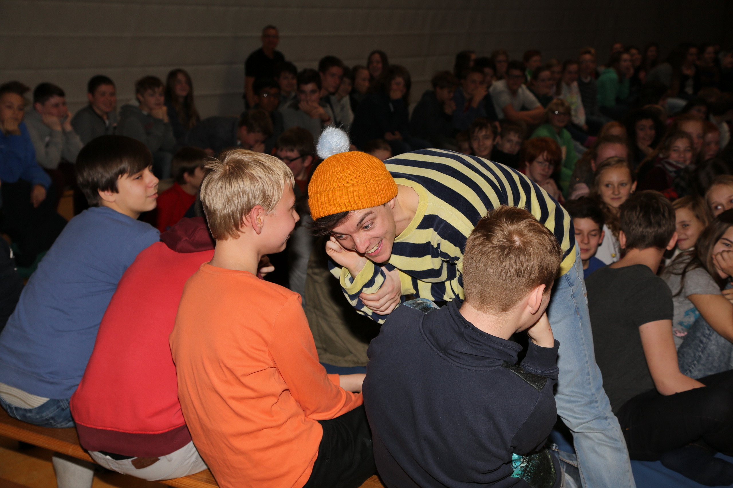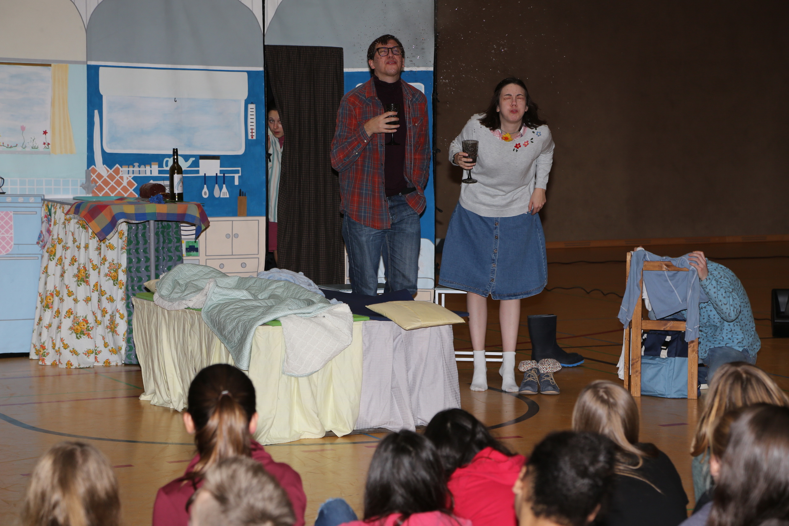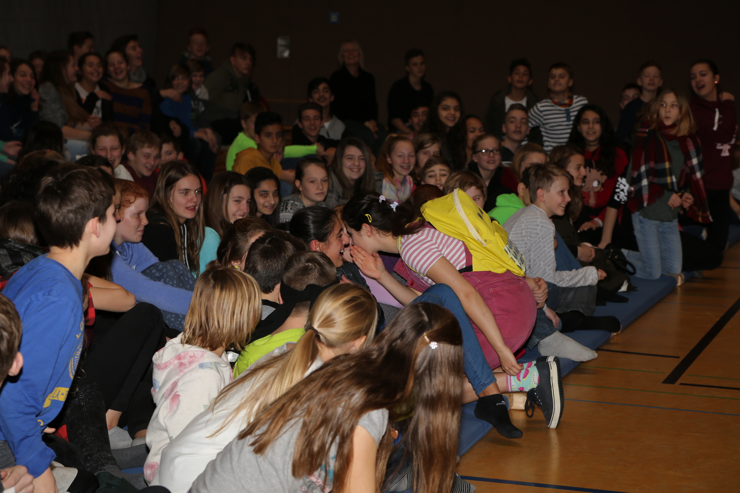 Das Stück wurde von den Schülerinnen und Schülern des 7.Jahrgangs begeistert aufgenommen. Gebannt verfolgten sie die Bemühungen von Luke und Megan und der ein oder andere fand sich womöglich in der Geschichte wieder. Eine Schrecksekunde gab es, als Luke und Megan sich direkt an das Publikum wandten und nach Ideen fragten, wie sie die Beziehung zwischen den Erwachsenen verhindern könnten. Schnell verschwanden die Köpfe der Schüler und Schülerinnen hinter ihren Vordermännern und Vorderfrauen, um bloß nicht angesprochen zu werden. Auch wenn sie vielleicht nicht angesprochen wurden, war der Kreislauf anschließend wieder in Schwung.