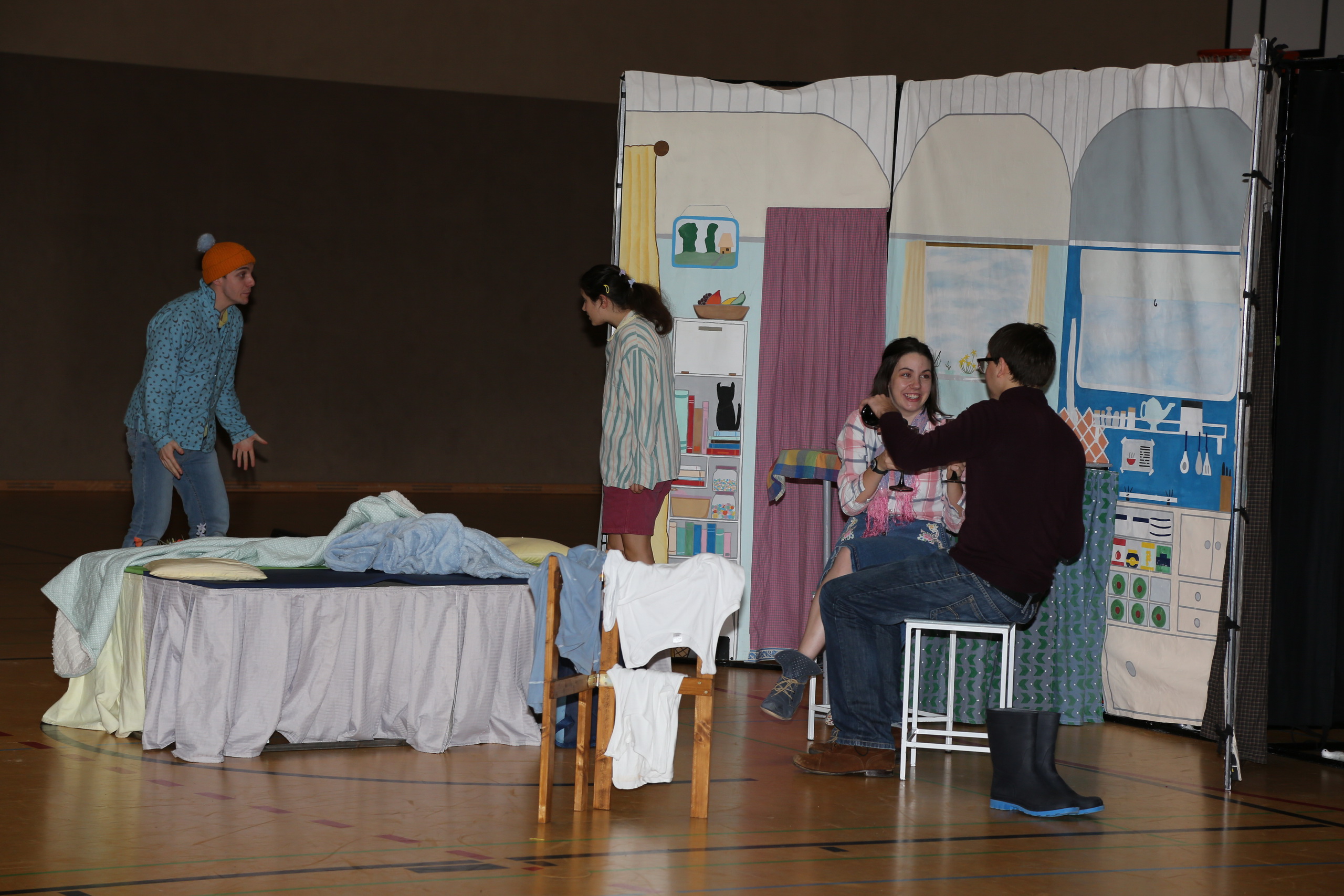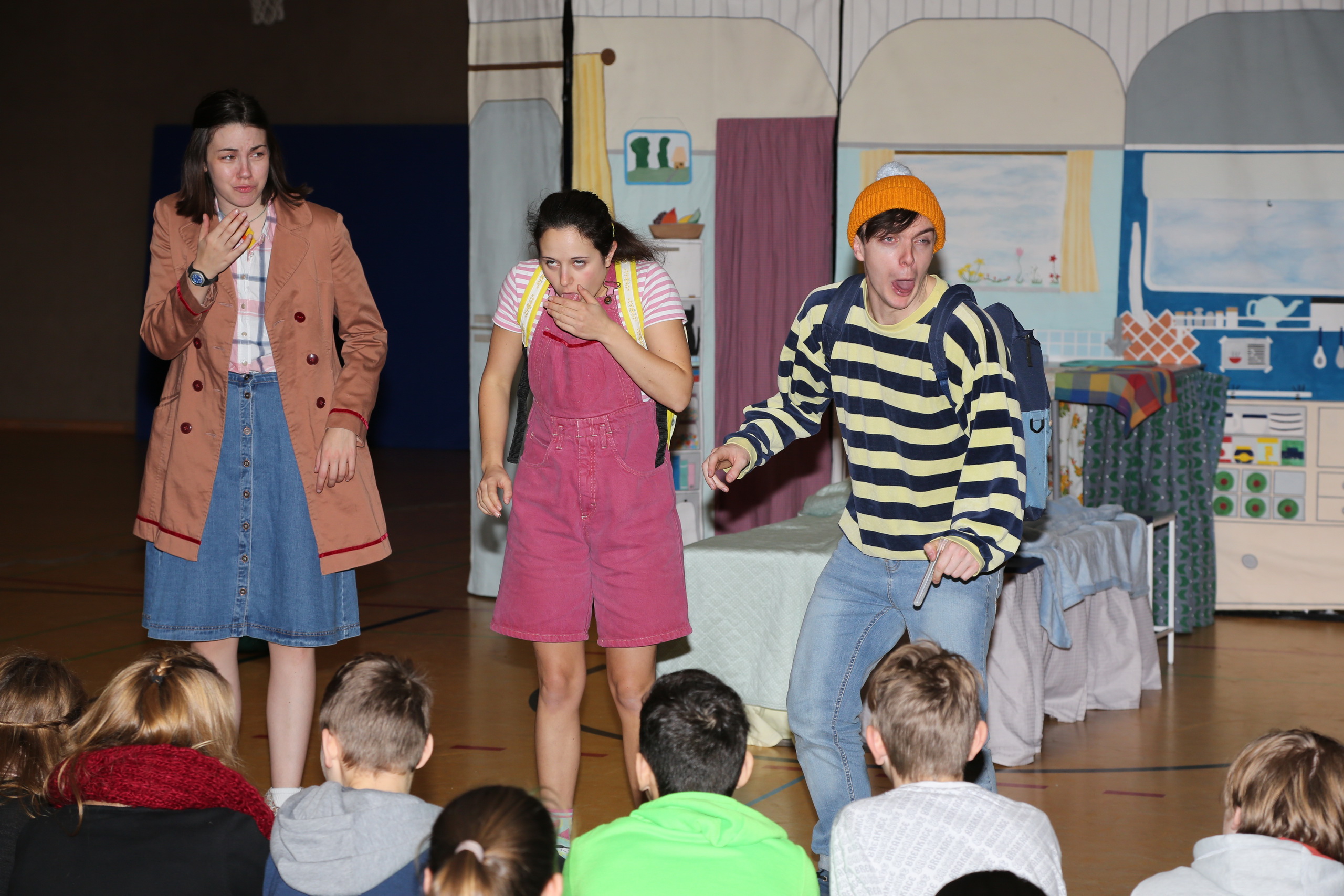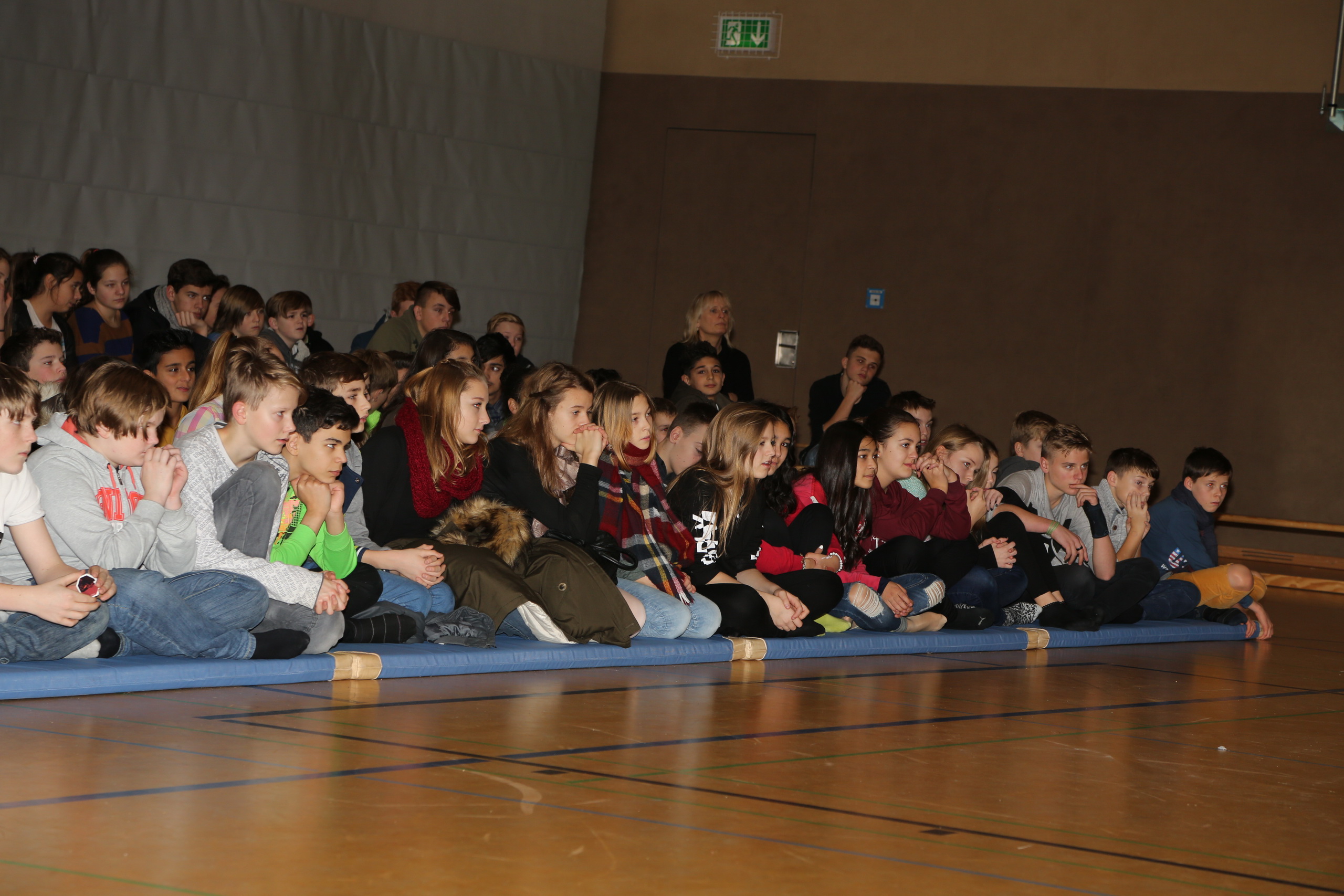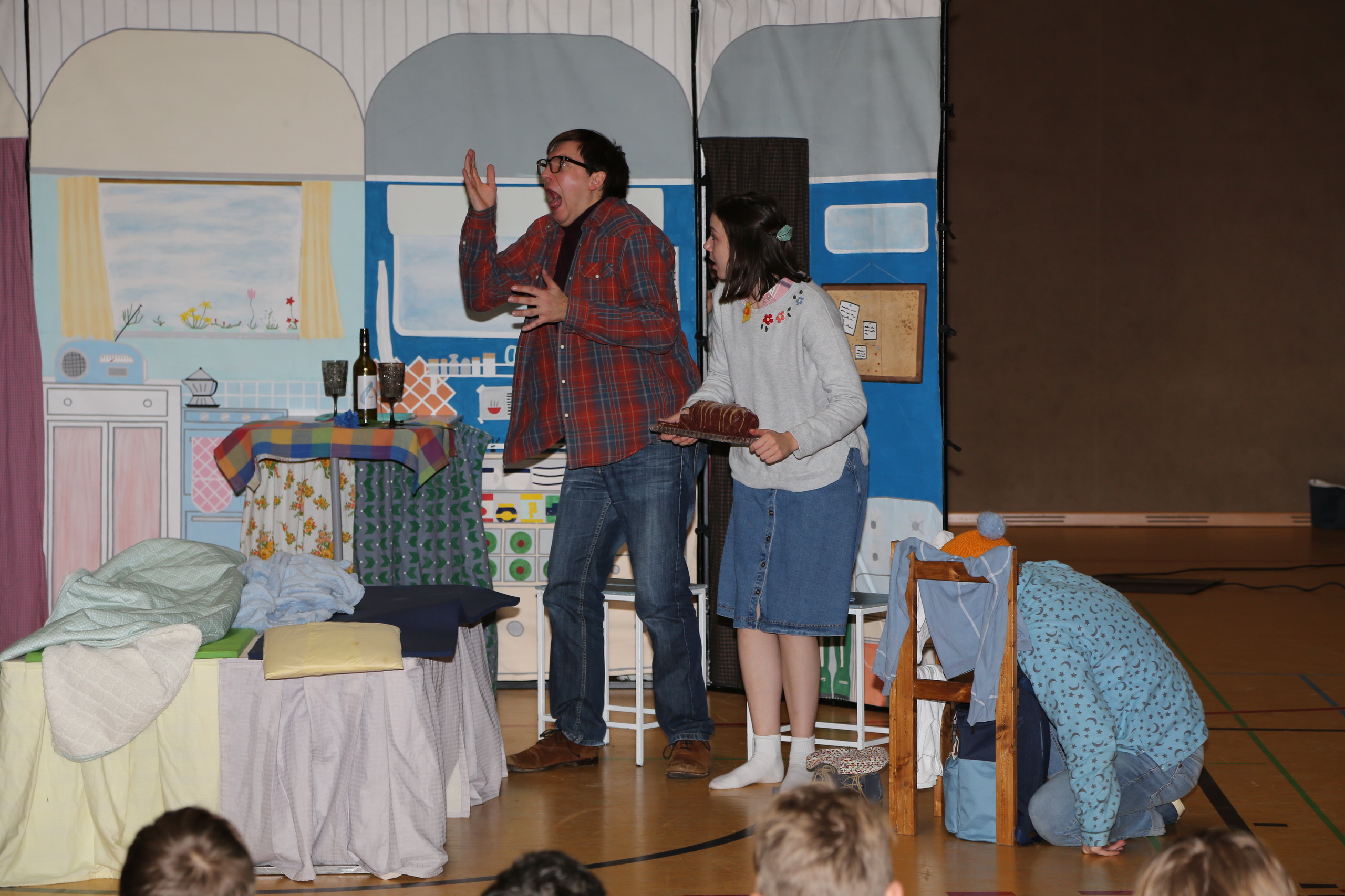 Das Stück wurde von den Schülerinnen und Schülern des 7.Jahrgangs begeistert aufgenommen. Gebannt verfolgten sie die Bemühungen von Luke und Megan und der ein oder andere fand sich womöglich in der Geschichte wieder. Eine Schrecksekunde gab es, als Luke und Megan sich direkt an das Publikum wandten und nach Ideen fragten, wie sie die Beziehung zwischen den Erwachsenen verhindern könnten. Schnell verschwanden die Köpfe der Schüler und Schülerinnen hinter ihren Vordermännern und Vorderfrauen, um bloß nicht angesprochen zu werden. Auch wenn sie vielleicht nicht angesprochen wurden, war der Kreislauf anschließend wieder in Schwung.