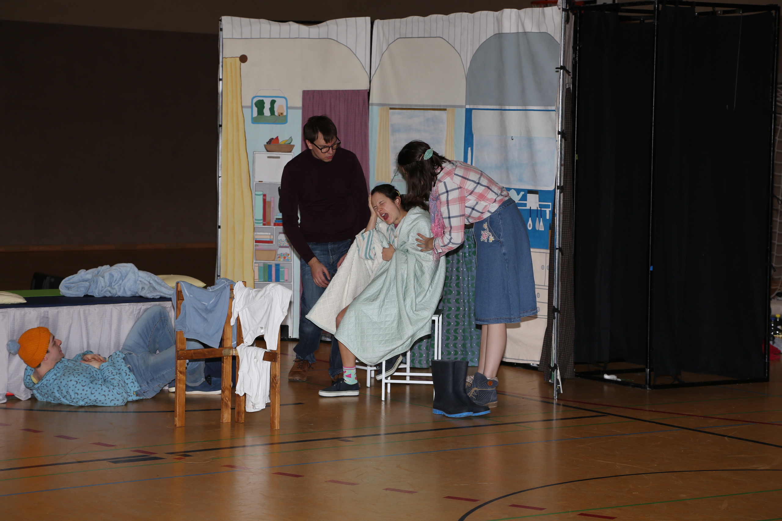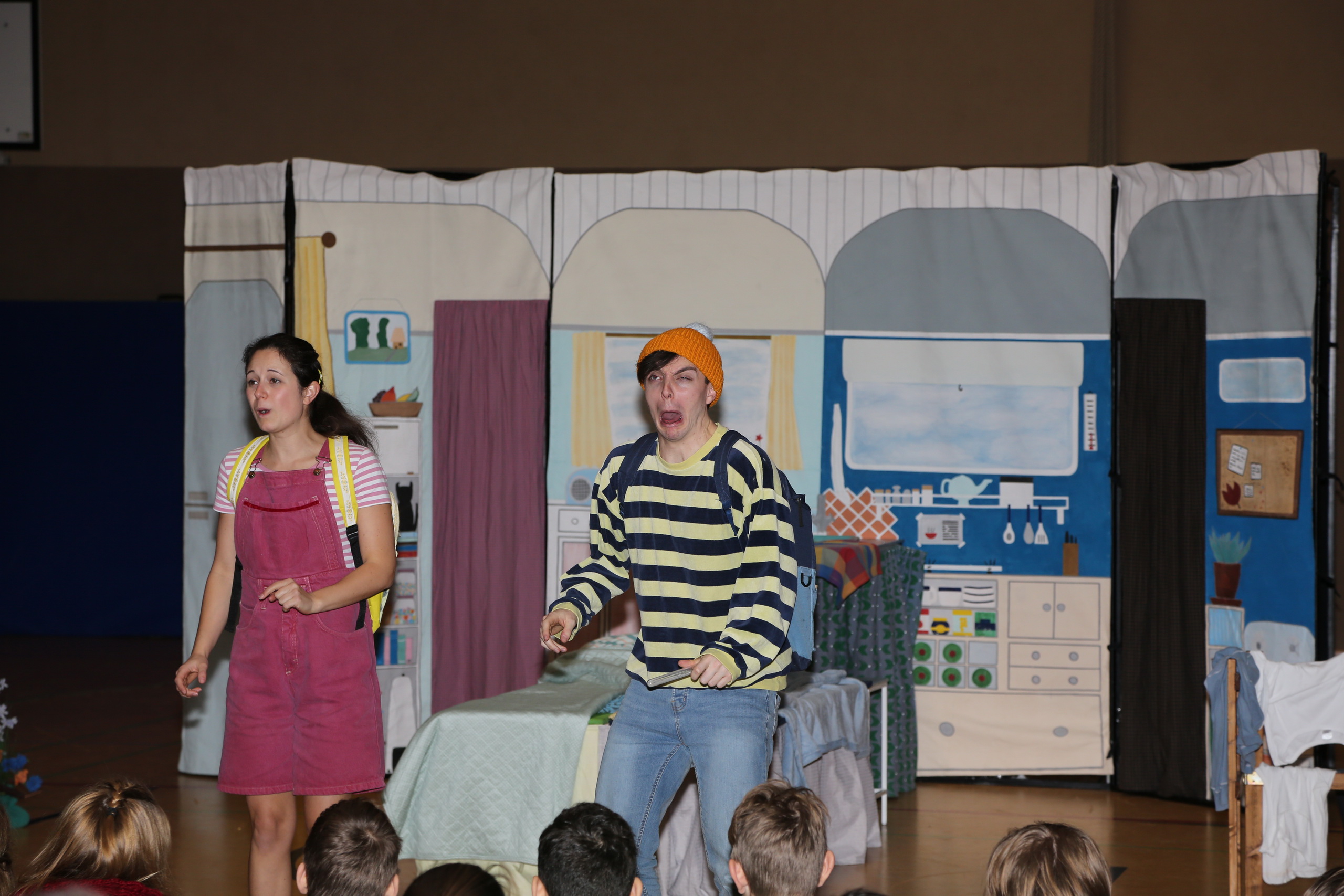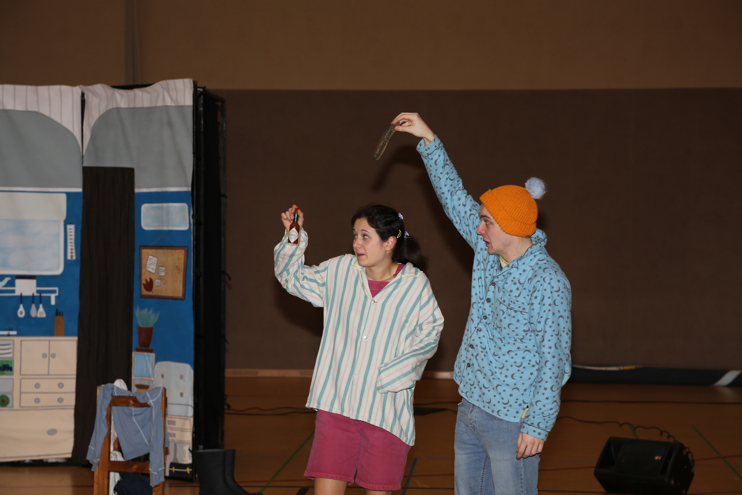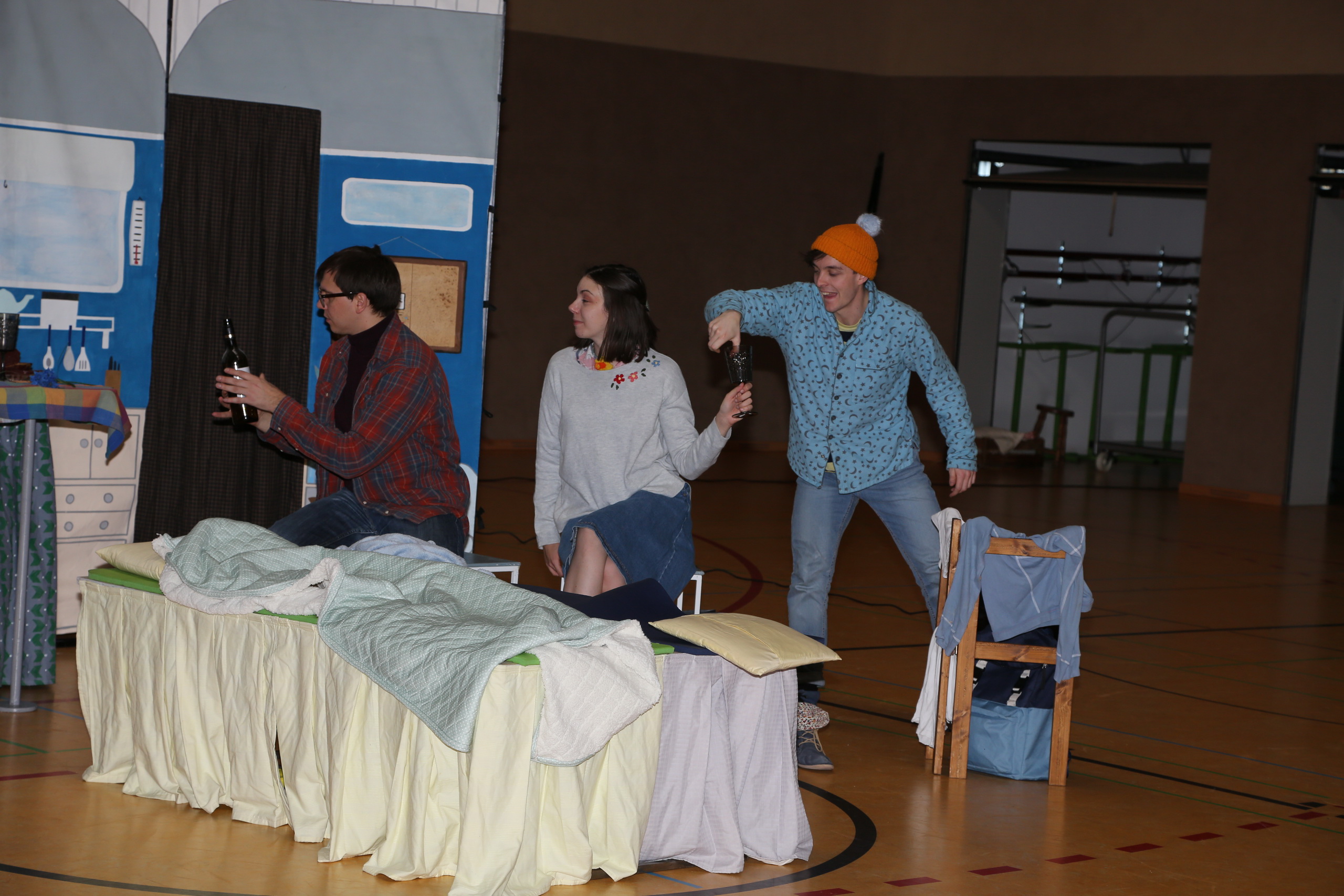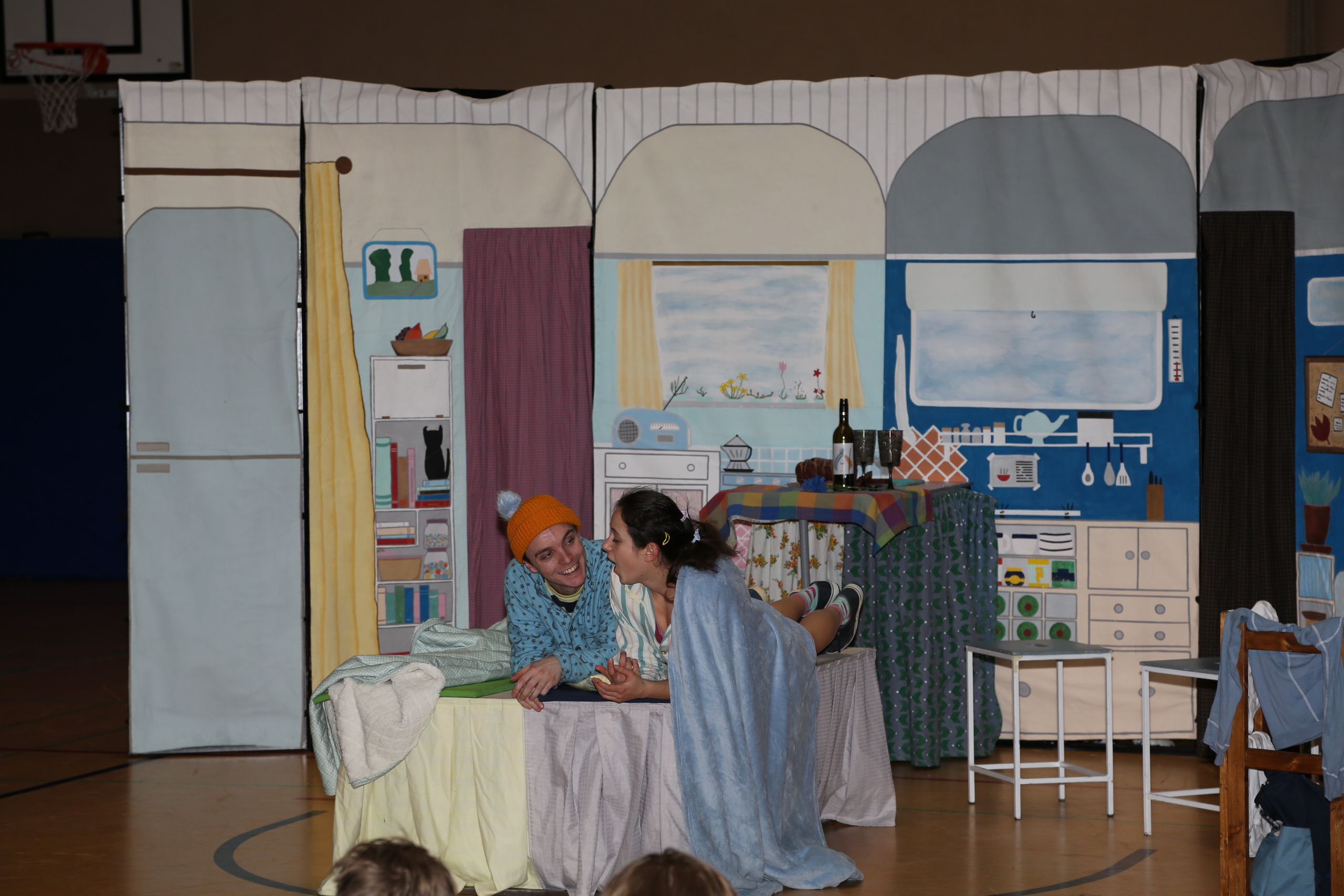 Das Stück wurde von den Schülerinnen und Schülern des 7.Jahrgangs begeistert aufgenommen. Gebannt verfolgten sie die Bemühungen von Luke und Megan und der ein oder andere fand sich womöglich in der Geschichte wieder. Eine Schrecksekunde gab es, als Luke und Megan sich direkt an das Publikum wandten und nach Ideen fragten, wie sie die Beziehung zwischen den Erwachsenen verhindern könnten. Schnell verschwanden die Köpfe der Schüler und Schülerinnen hinter ihren Vordermännern und Vorderfrauen, um bloß nicht angesprochen zu werden. Auch wenn sie vielleicht nicht angesprochen wurden, war der Kreislauf anschließend wieder in Schwung.