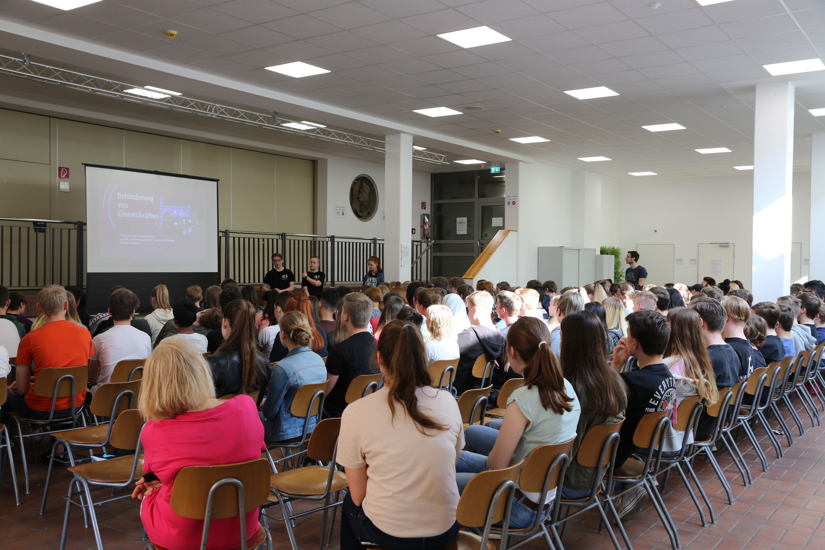Die Idee dazu kam von den Schulsanitätern Vanessa Wohlfahrt (10. Jg.), Philip Kasten (8. Jg.) und Tim Laucke (9. Jg.), die die Veranstaltung selbstständig geleitet haben. Neben allgemeinen Informationen, wie z. B. die Definition des Begriffs, mögliche Strafmaßnahmen oder die „Rettungskette“, ging es vor allem um die Sensibilisierung der Schüler und Schülerinnen im schulischen Umfeld, denn hier kam es bereits zu Zwischenfällen, die den Ersthelfern die Arbeit erschwerten. Abgerundet wurde der Vortrag durch ein kurzes Video, das die aktuelle Thematik eindringlich veranschaulicht hat. Insgesamt wurde die Aktion sowohl von der Schülerschaft als auch von den Lehrkräften überwiegend positiv aufgenommen, so dass der Schulsanitätsdienst damit einen wichtigen Beitrag für einen besseren Umgang miteinander geleistet hat.