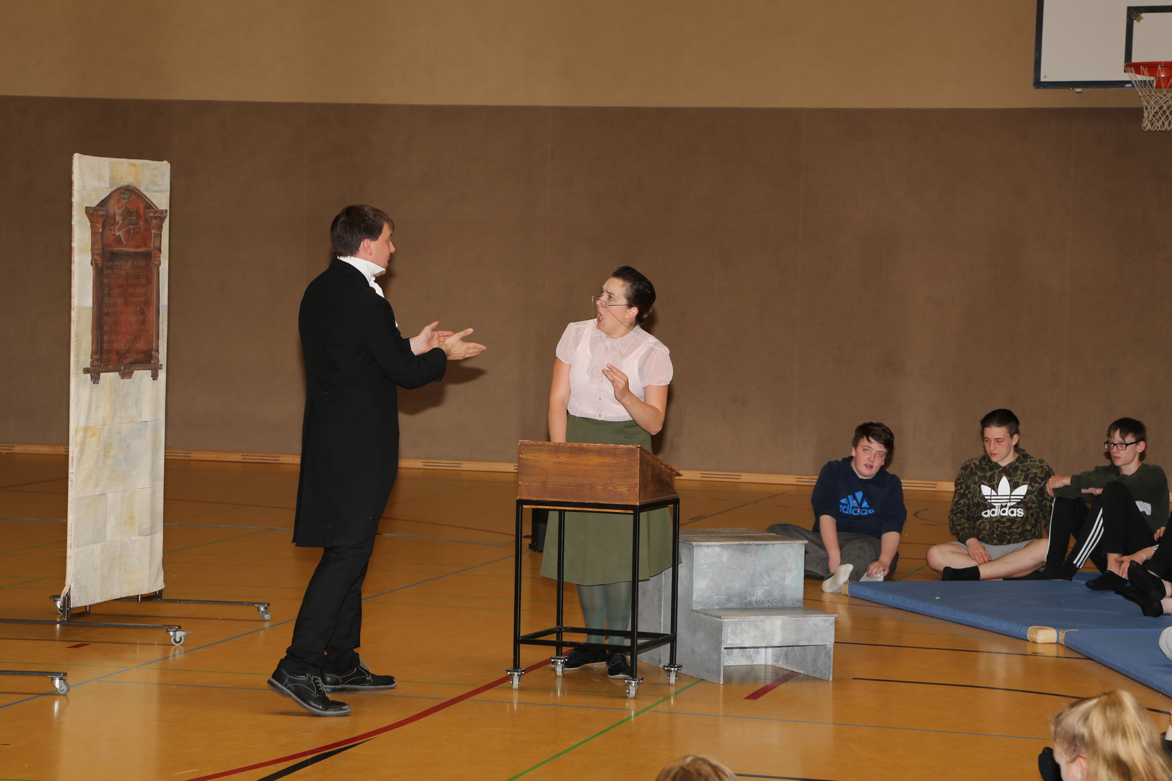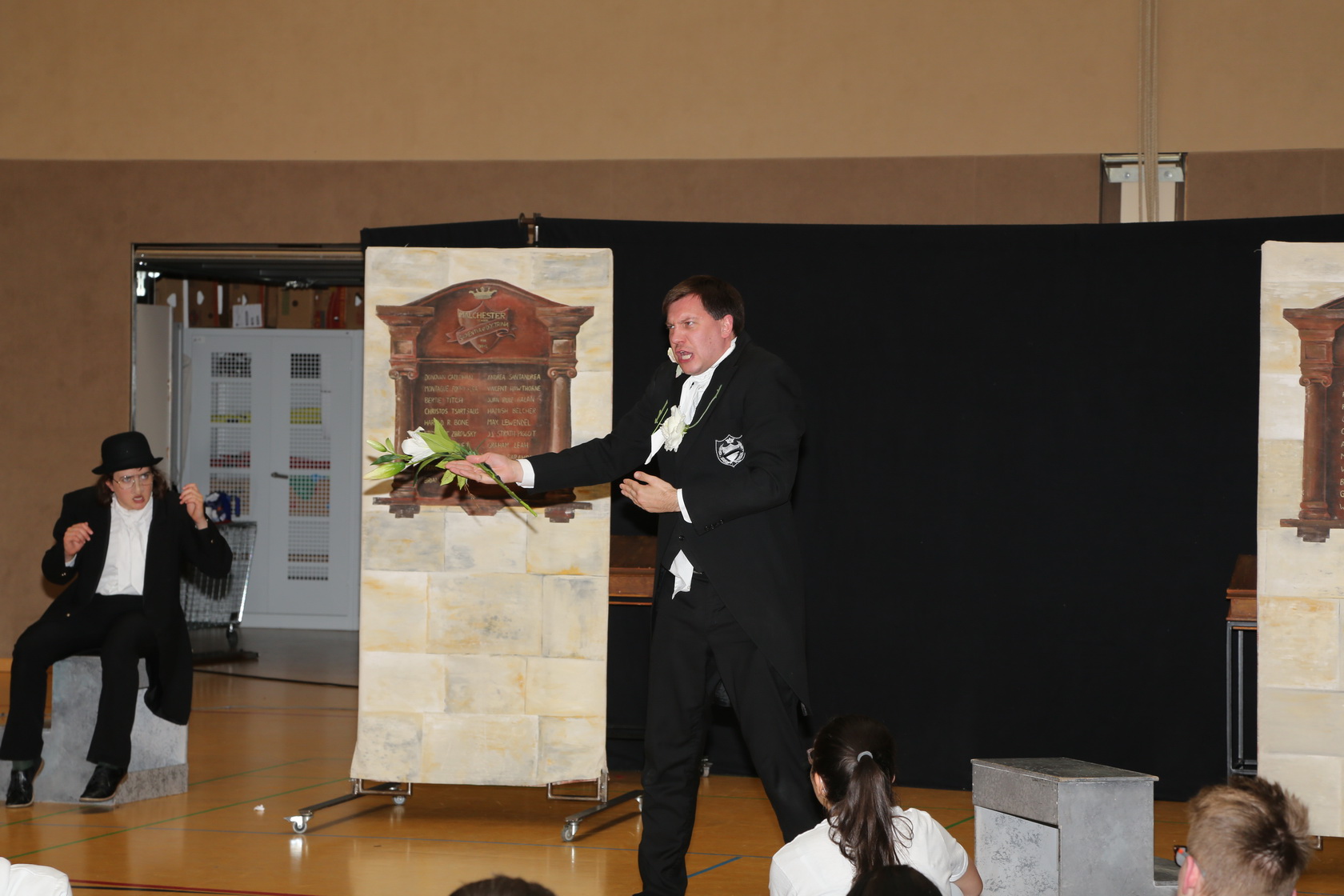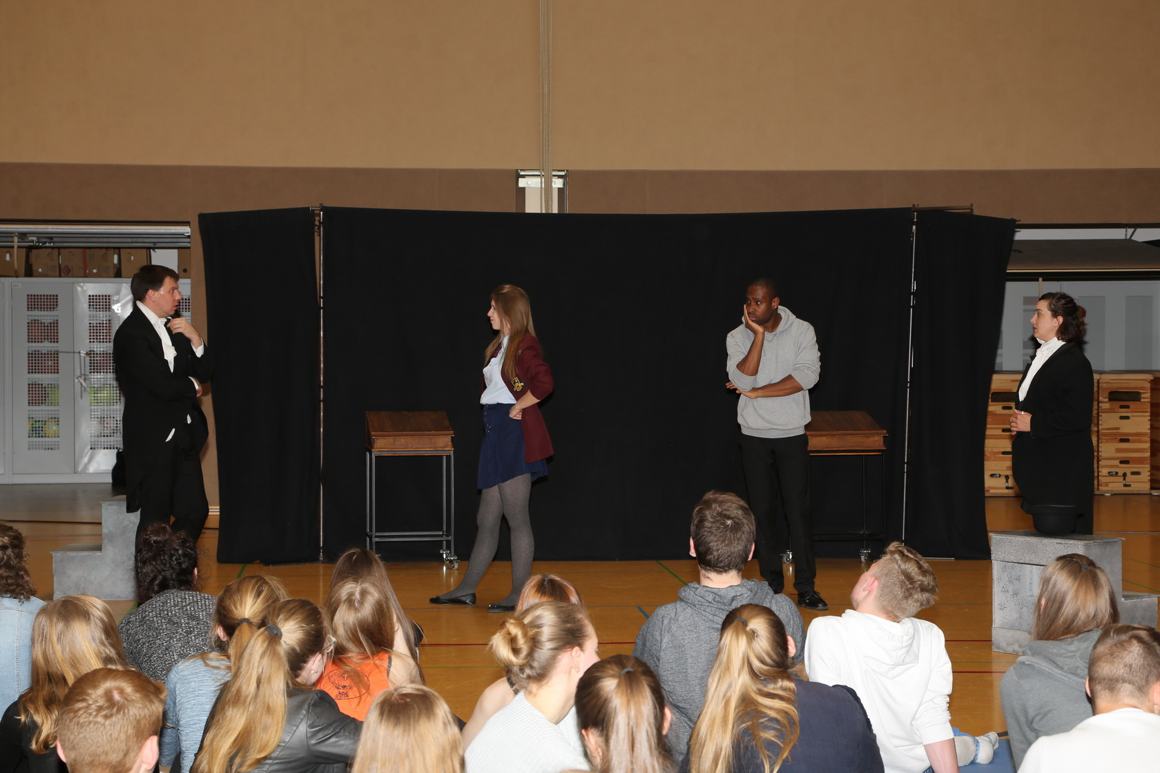 Die gesamte Sekundarstufe I kam in den Genuß eines Theaterstücks in Englischer Sprache, aufgeführt von Muttersprachlern. Die Schülerinnen und Schüler der Jahrgänge 5 und 6 verfolgten das Stück „Billy`s Friend“ mit großer Aufmerksamkeit und viel Spaß.
