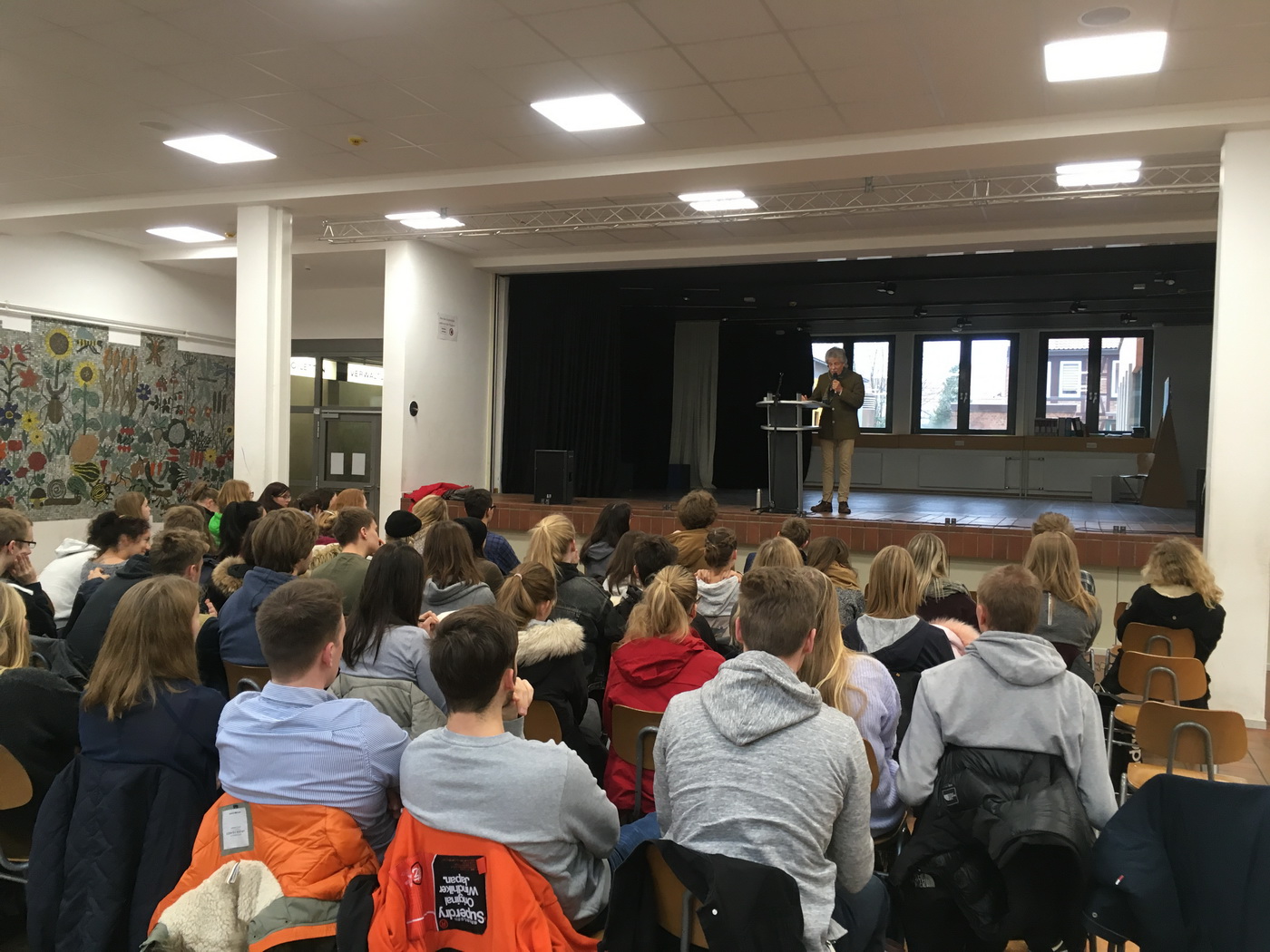 Die Darstellenden Spiel Kurse des 11. Jahrgangs präsentierten ihre selbstentwickelten Stücke abends auf der Bühne in der Pausenhalle der IGS Wallstraße vor vollem Haus.