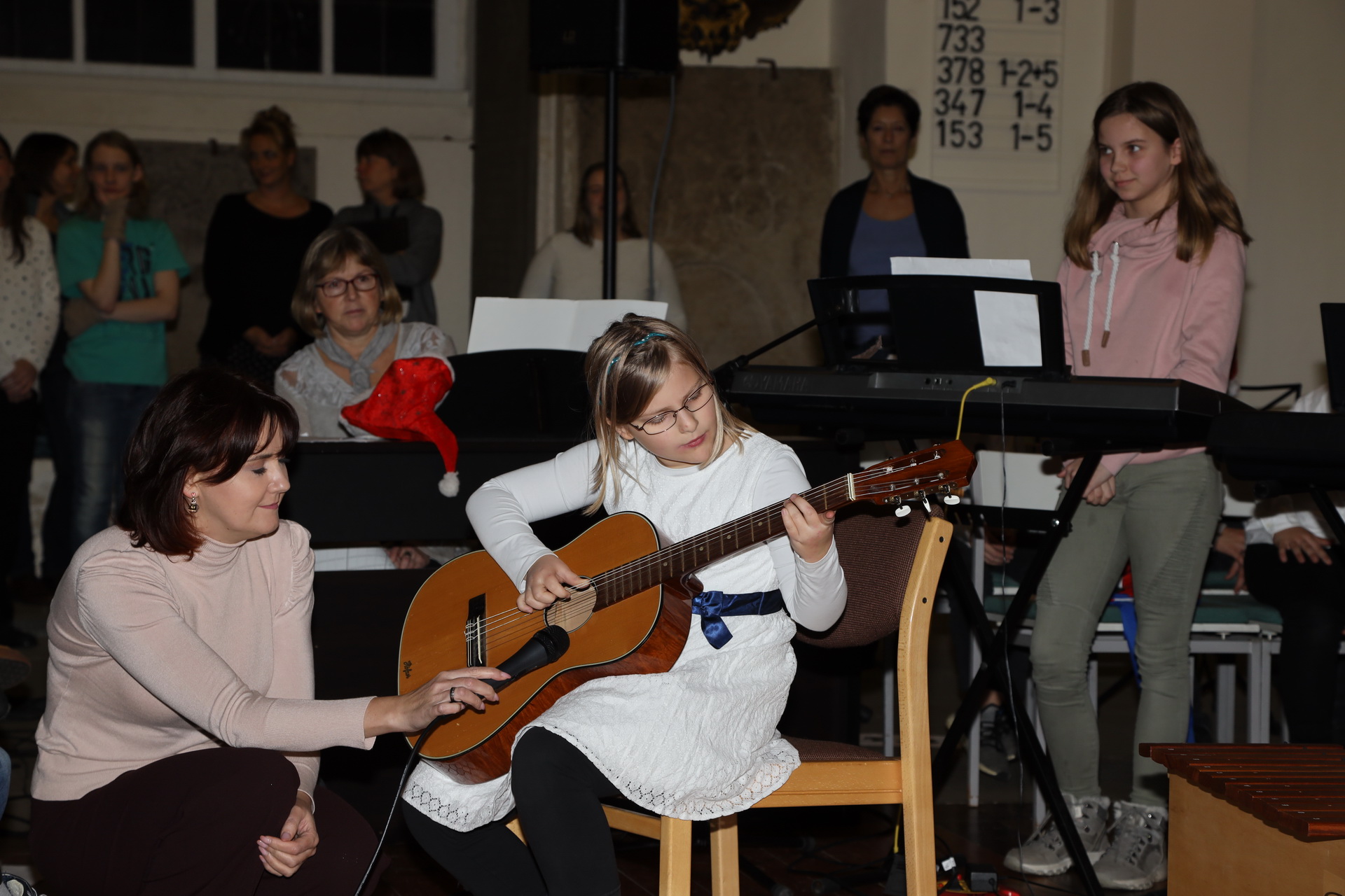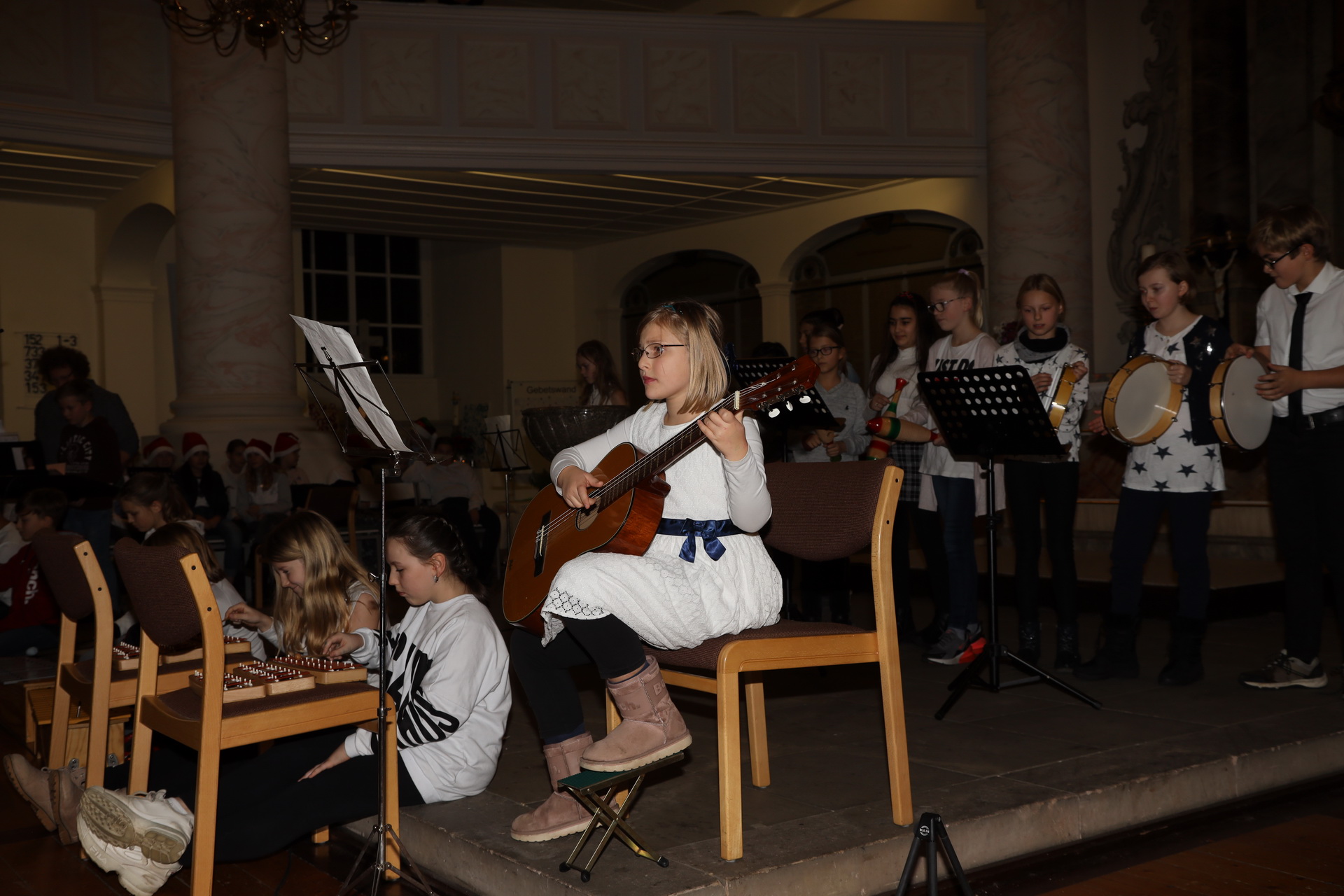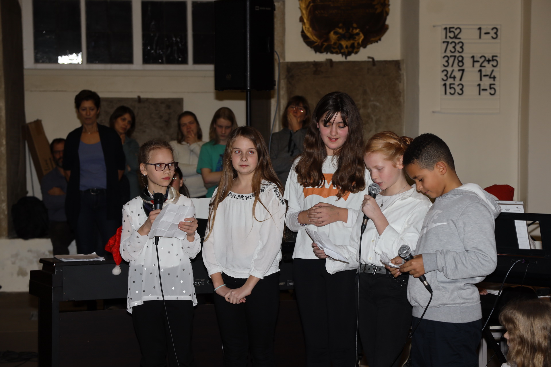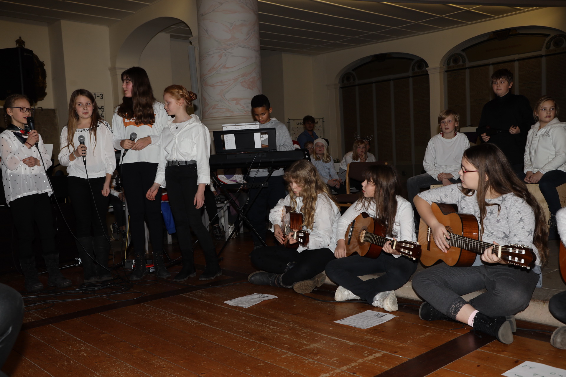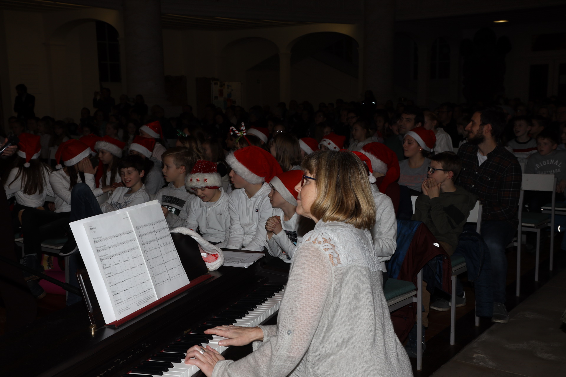 Alle 135 Fünftklässler begannen mit einem Einmarsch und dann wurden ungewöhnliche Instrumental- und Vokalstücke von den fünf Klassen zum Vortrag gebracht. Mit von der Partie waren auch die Chor AG und der Lehrerchor.