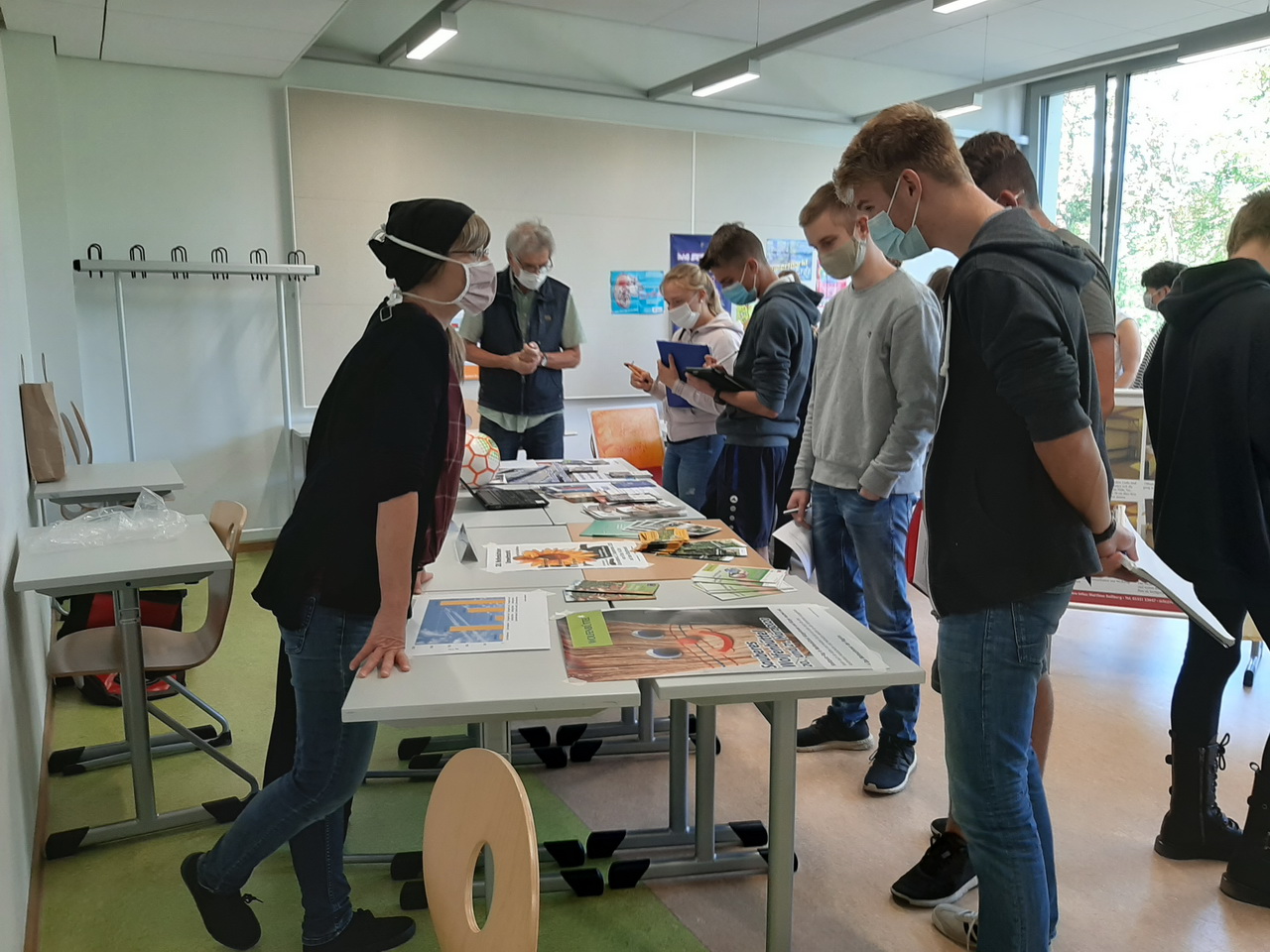 Am 17.09.2020 lud Frau Rösel im Rahmen des Seminarfaches „Nachhaltigkeit und Umweltschutz“ (Jg. 12) Frau Schilling (NABU), Frau Wolf (AHA-Erlebnismuseum), Frau Münstermann-Kreifels (Stadt Wolfenbüttel), Herrn Knoche-Herwig (Weltladen), Herrn Roßberg (Garten-, Landschafts- und Umweltbau) und Herrn Schröder (Uni Hannover) zu einem Markt der Möglichkeiten in die Oberstufe der IGS Wallstraße ein.