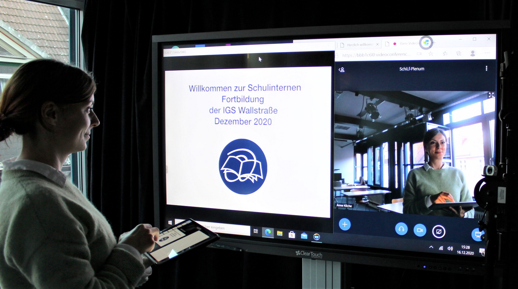 Digitales Lehren und Lernen hat in diesem Jahr verstärkt Einzug gehalten in allen Schulen. Zwar war die IGS Wallstraße auch vor der Corona-Pandemie bereits gut mit digitalen Lehr- und Lernmitteln ausgestattet. Aber die aktuelle Lage erfordert noch mehr Beschäftigung mit den Möglichkeiten von Schulcloud, Videokonferenzen und Aufgabenmodulen. Dies nahm die Schule zum Anlass und veranstaltete an den ersten beiden Tagen der Weihnachtsferien eine Lehrer*innenfortbildung zum Thema digitale Lehre.