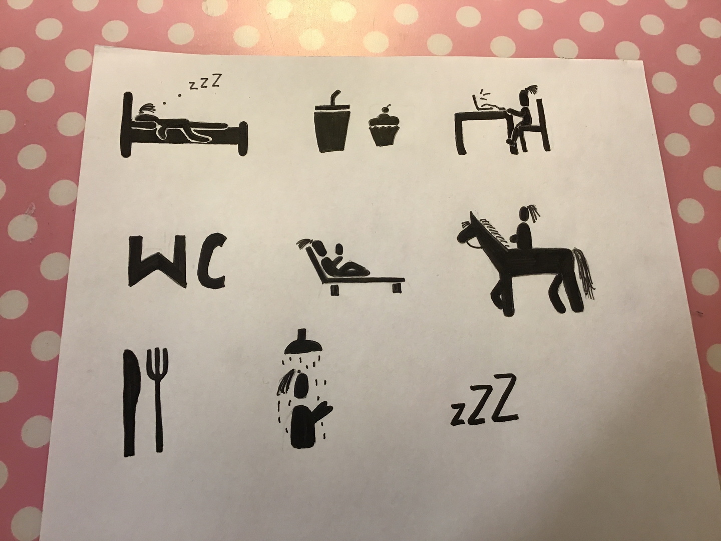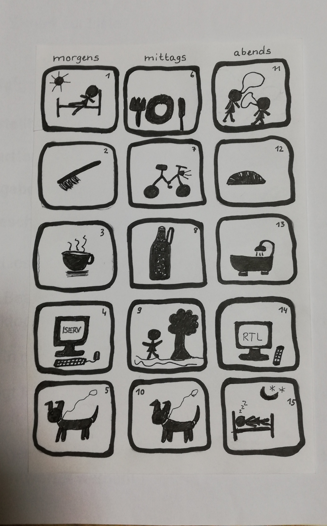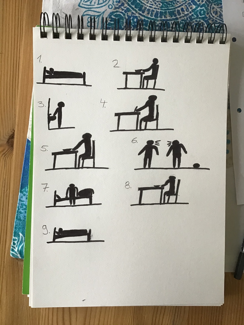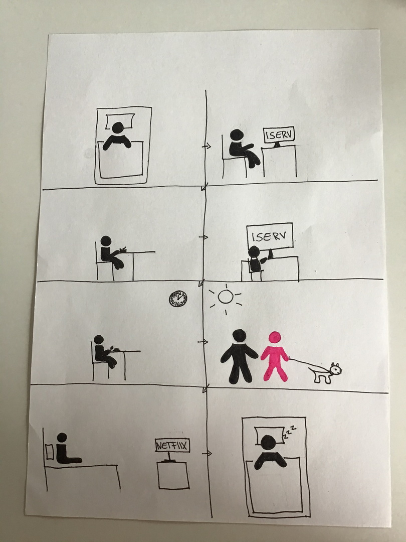 Der Arbeitsauftrag hieß: Zeichnet in mindestens 8 Einzel-Piktogrammen(gern auch mehr) auf einer Seite euren Tagesablauf im Lockdown(an einem Wochentag) nach. Die Reihenfolge sollte klar erkennbar sein: Also bieten sich Anordnungen im Kreis, untereinander, von links nach rechts, nummeriert usw. an.