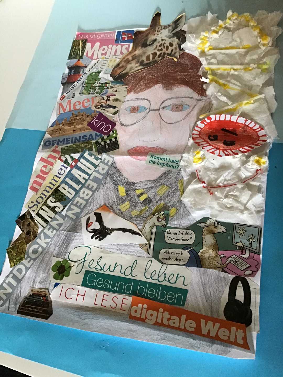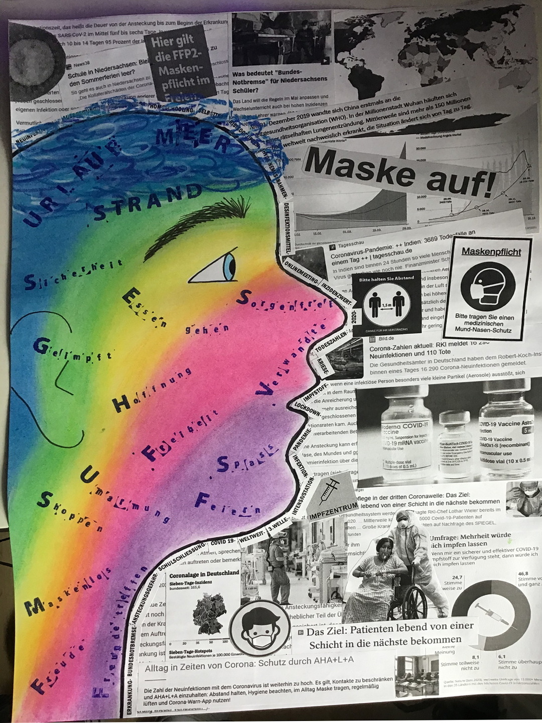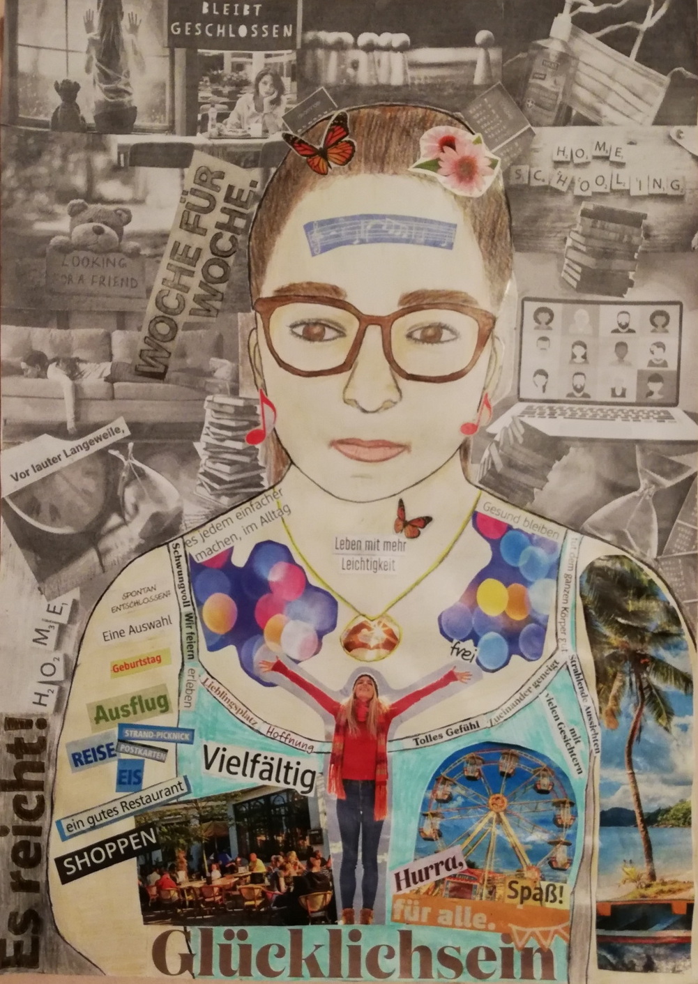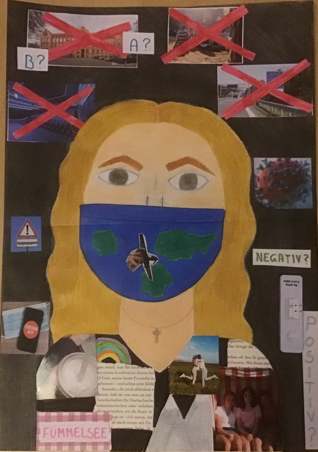 Zu diesen Fragen haben Jugendliche der Klassen 9.1 und 9.4 im Rahmen eines Homeschooling-Kunstprojekts /B-Szenario Selbstportraits (Thema 2Menschendarstellung“) gestaltet, die ihre Gefühlslage nach einem Jahr Corona wiedergeben. Dabei probierten sie verschiedene Collage-und Mischtechniken aus, die meisten von ihnen analog. Angelehnt an: artsetc
