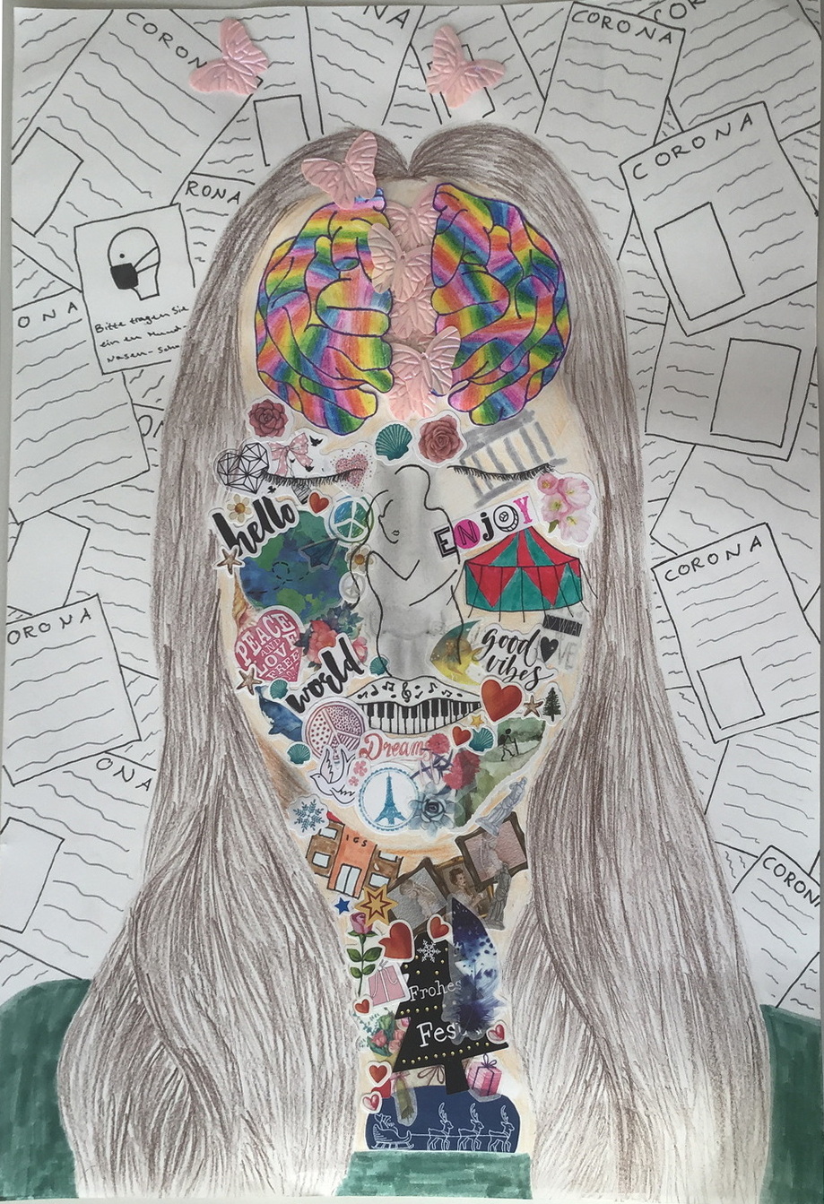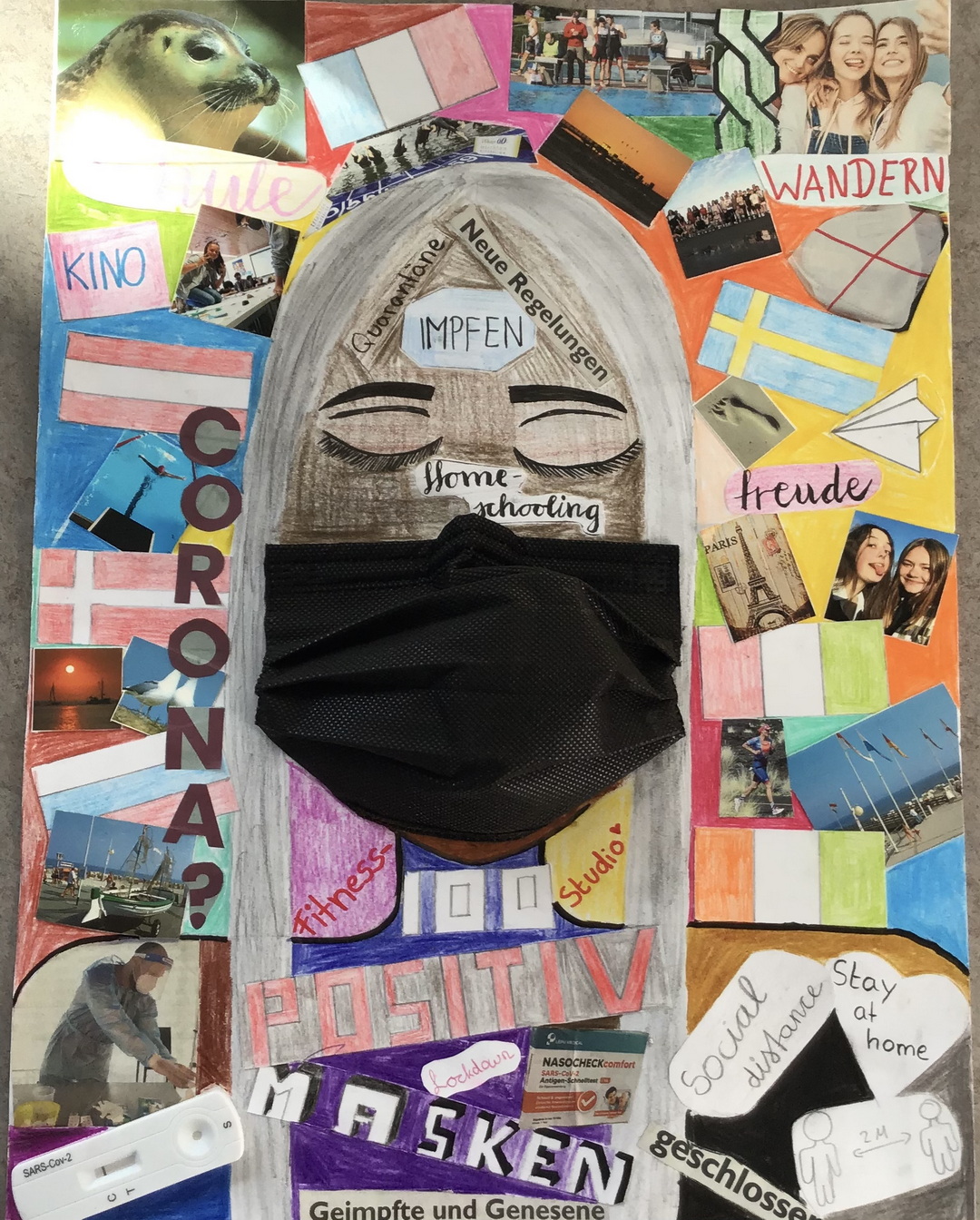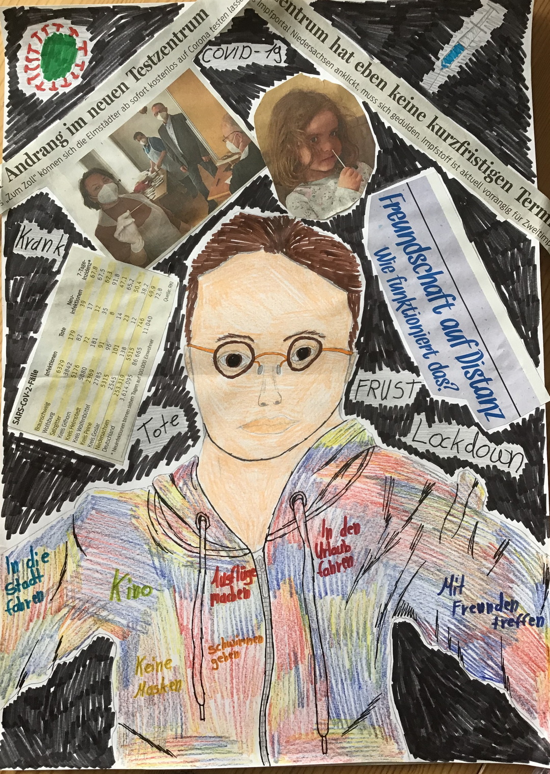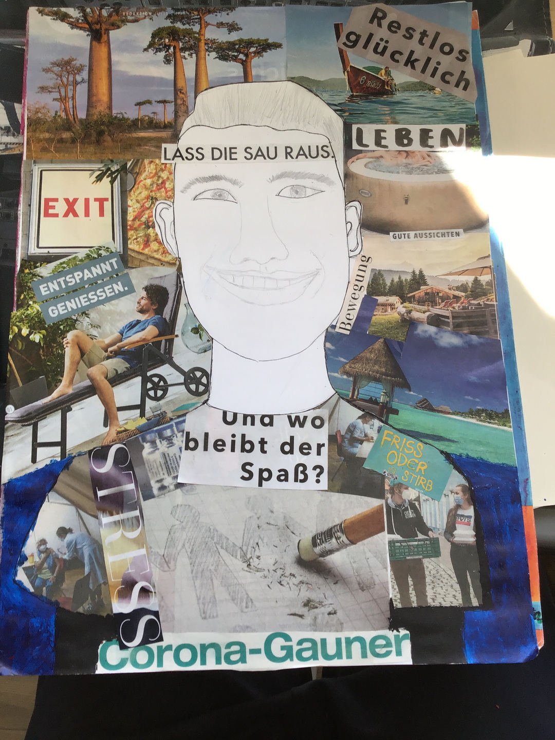 Zu diesen Fragen haben Jugendliche der Klassen 9.1 und 9.4 im Rahmen eines Homeschooling-Kunstprojekts /B-Szenario Selbstportraits (Thema 2Menschendarstellung“) gestaltet, die ihre Gefühlslage nach einem Jahr Corona wiedergeben. Dabei probierten sie verschiedene Collage-und Mischtechniken aus, die meisten von ihnen analog. Angelehnt an: artsetc