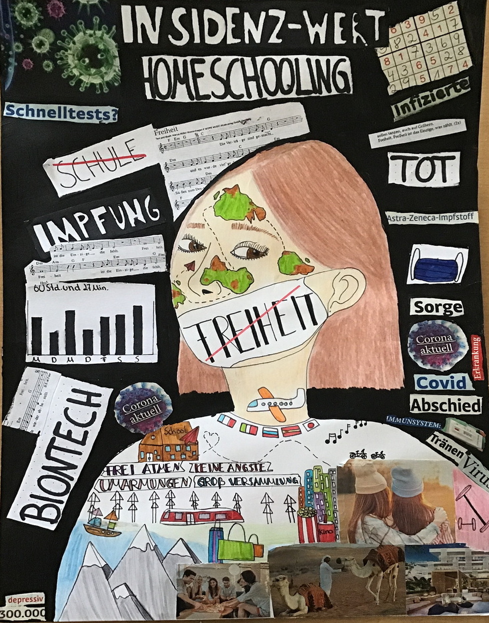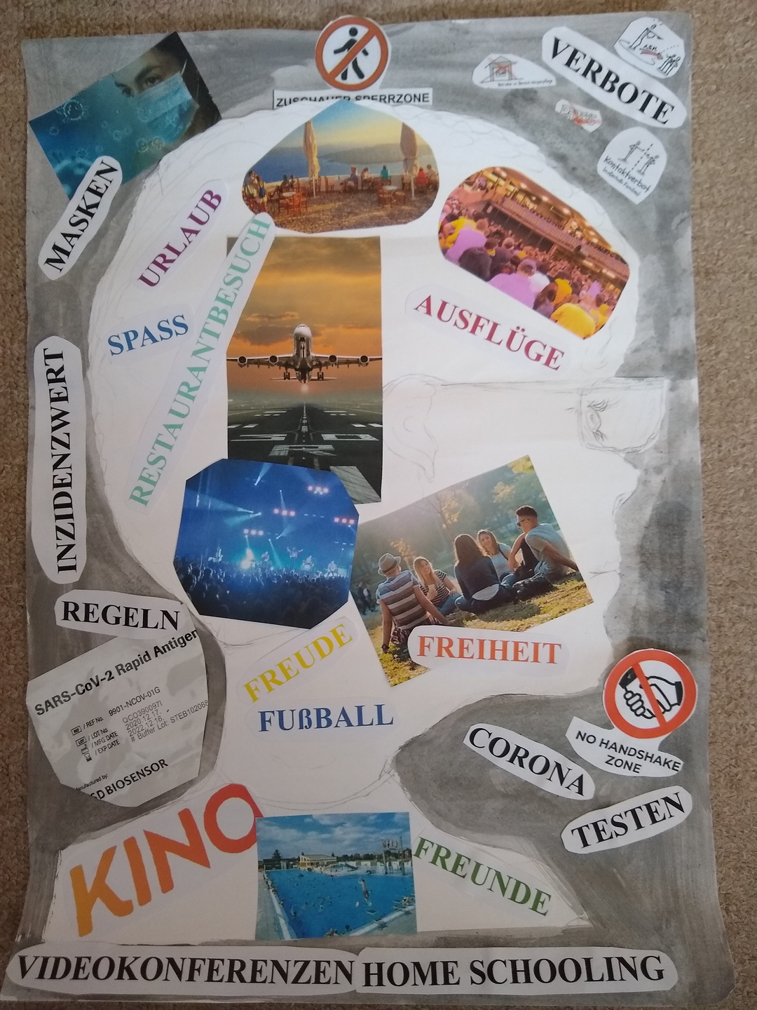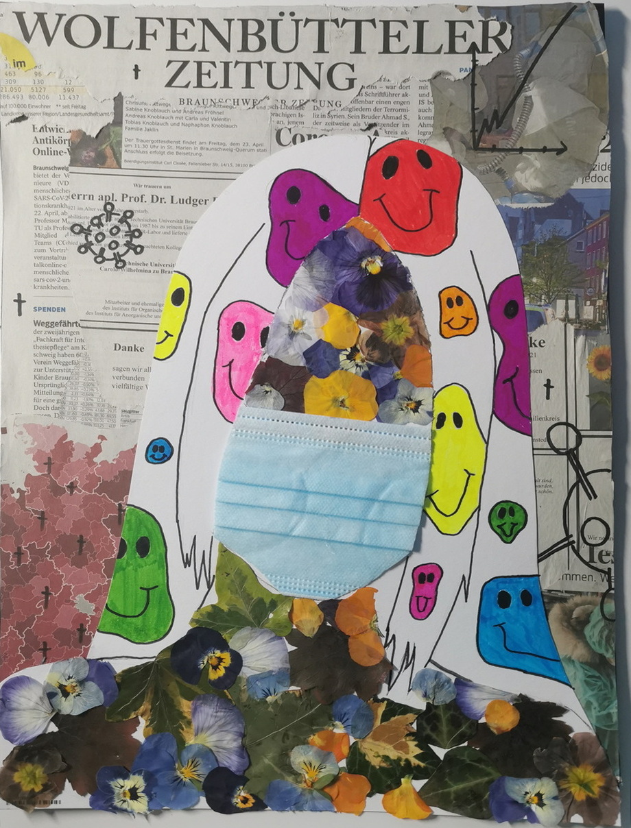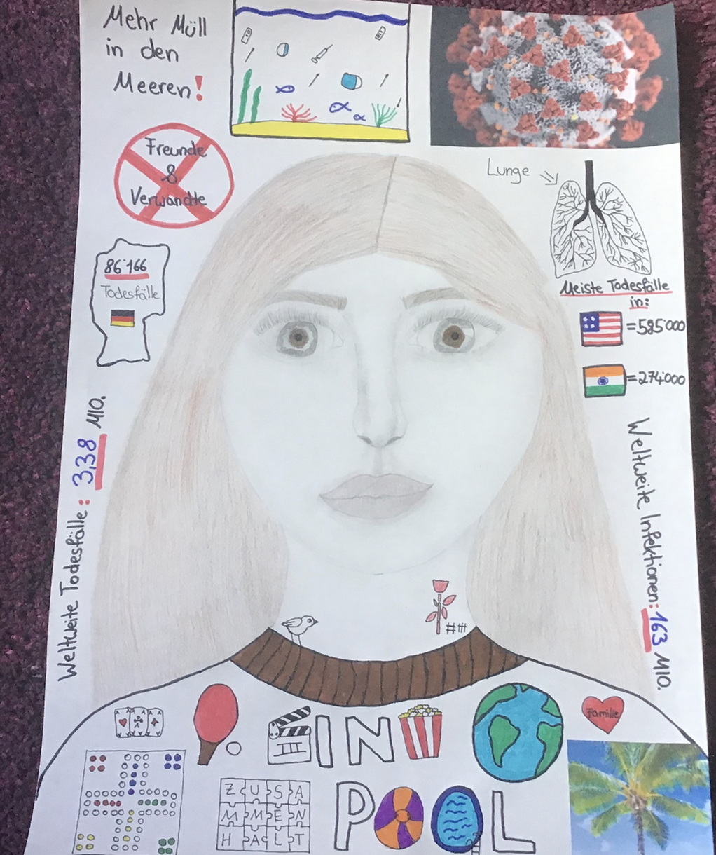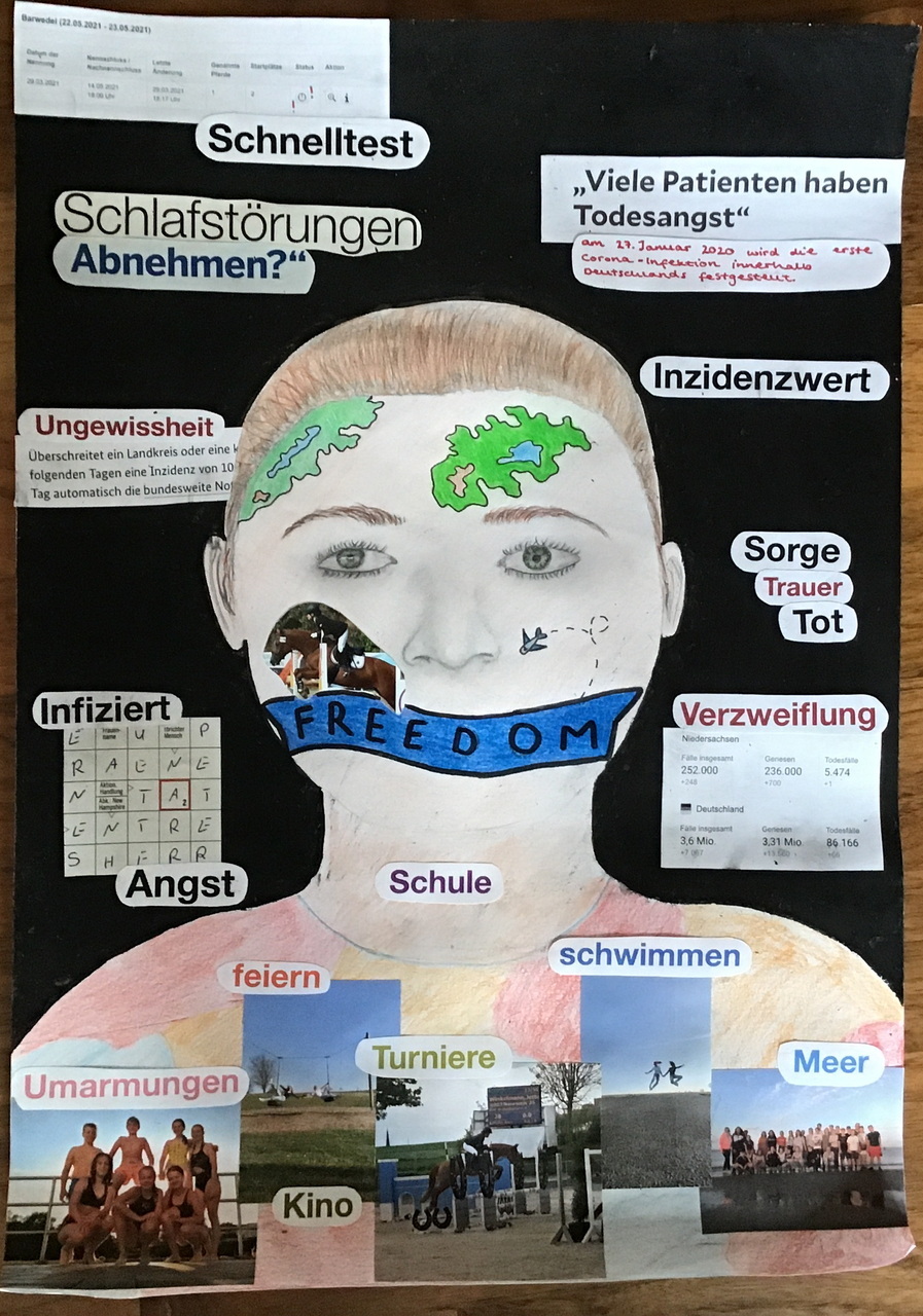 Zu diesen Fragen haben Jugendliche der Klassen 9.1 und 9.4 im Rahmen eines Homeschooling-Kunstprojekts /B-Szenario Selbstportraits (Thema 2Menschendarstellung“) gestaltet, die ihre Gefühlslage nach einem Jahr Corona wiedergeben. Dabei probierten sie verschiedene Collage-und Mischtechniken aus, die meisten von ihnen analog. Angelehnt an: artsetc