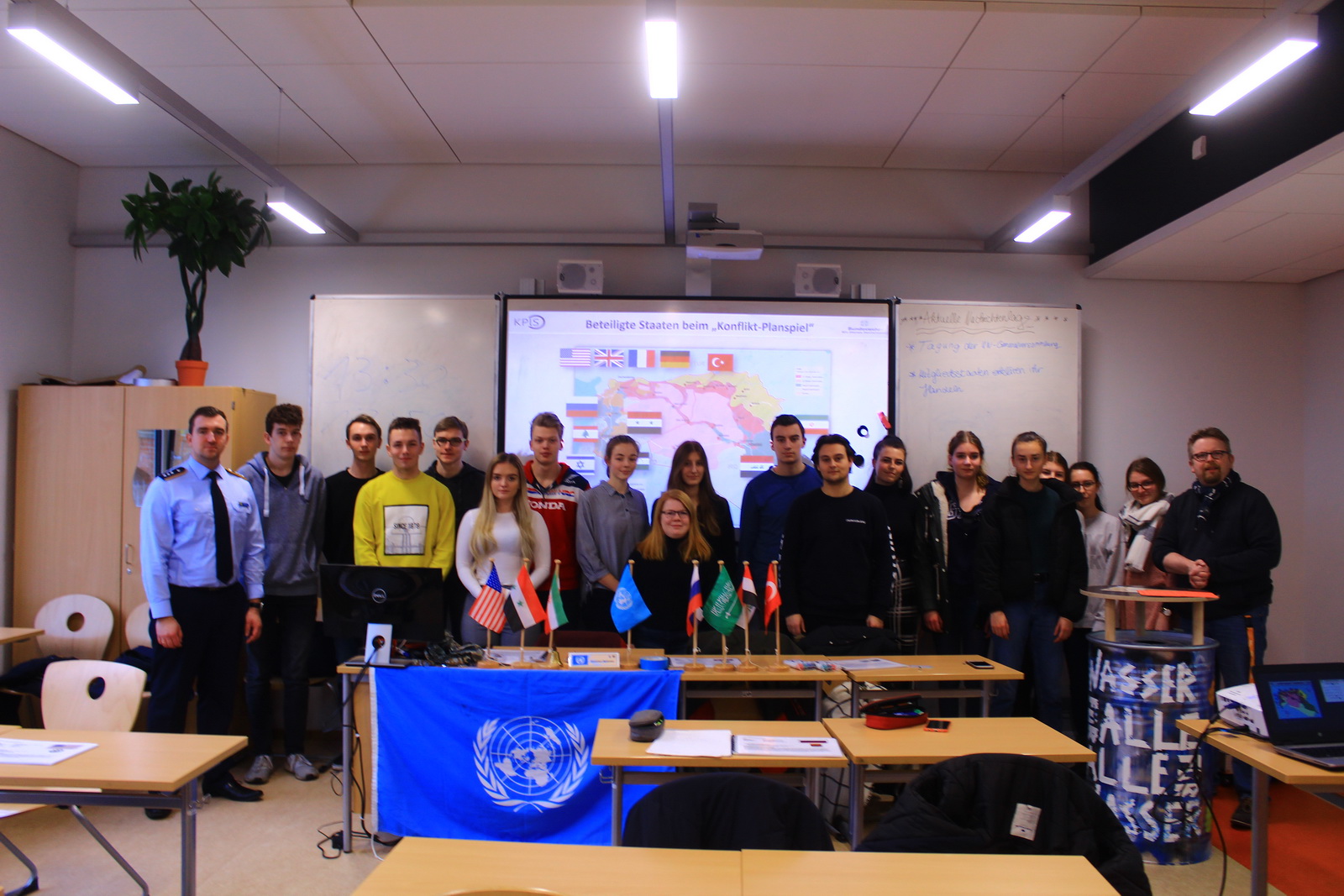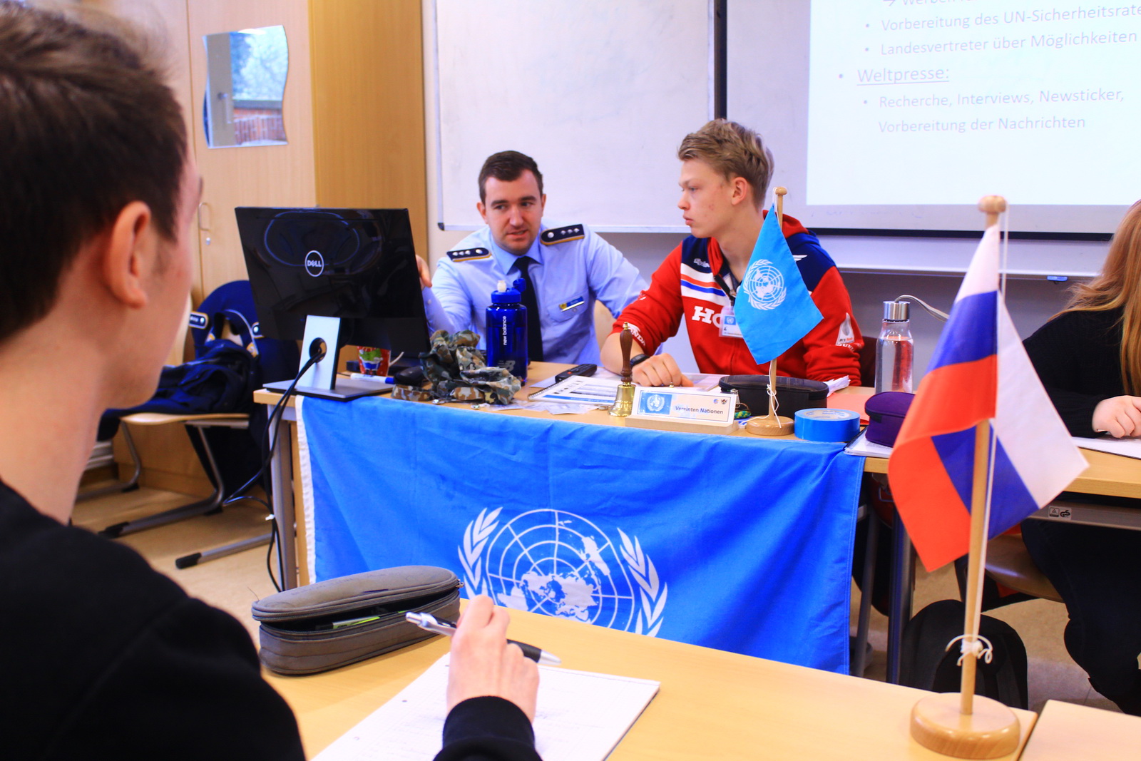 Anknüpfend an diese Thematik besuchte Jugendoffizier Alexander Bode von der Bundeswehr uns im Oberstufengebäude, um mit allen drei Politikkursen ein sogenanntes „Konflikt-Planspiel“, basierend auf den Ereignissen des Syrienkonfliktes (Stand: 2014), durchzuführen. Nach einer kurzen Einführung zur Konfliktsituation wurden den Schülern zu zweit jeweils ein Land bzw. ein UN- Mitgliedsstaat zugeteilt, darunter zum Beispiel Russland, die Türkei, die USA und Syrien. Innerhalb der „Zweierteams“ gab es die Rolle des Regierungschefs und die des Staatsministers. Für die Leitung der UN-Generalversammlung wurde außerdem ein Generalsekretär und für die öffentliche Transparenz Vertreter der Weltpresse gewählt. Mithilfe von in der Generalversammlung gehaltenen Reden, konnten Interessen unter den UN-Mitgliedern ausgetauscht und mögliche Lösungen gesucht werden.